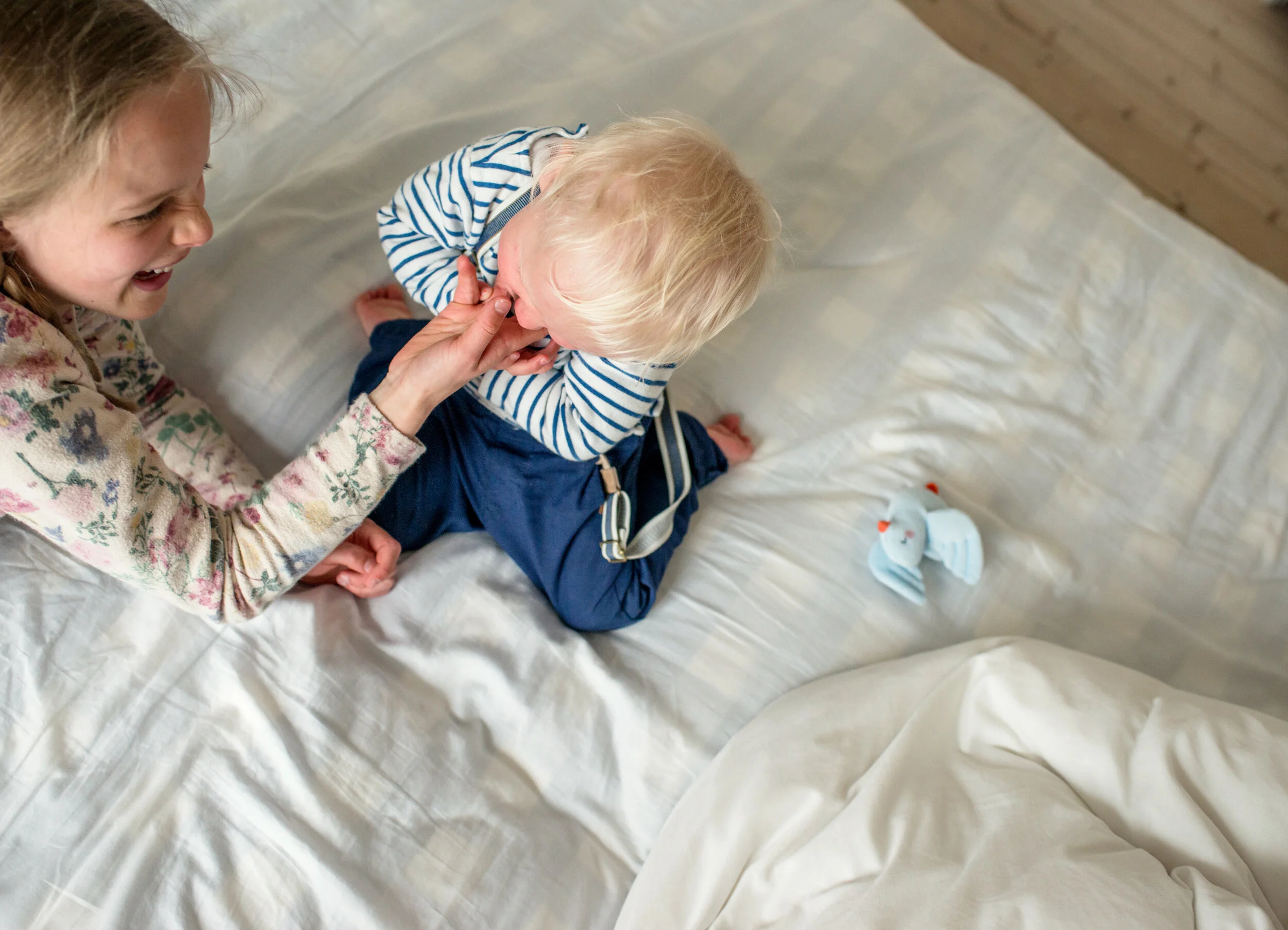 Auch Geschwisterkinder lasse ich gerne auf dem Bett toben und sich gegenseitig abkitzeln …